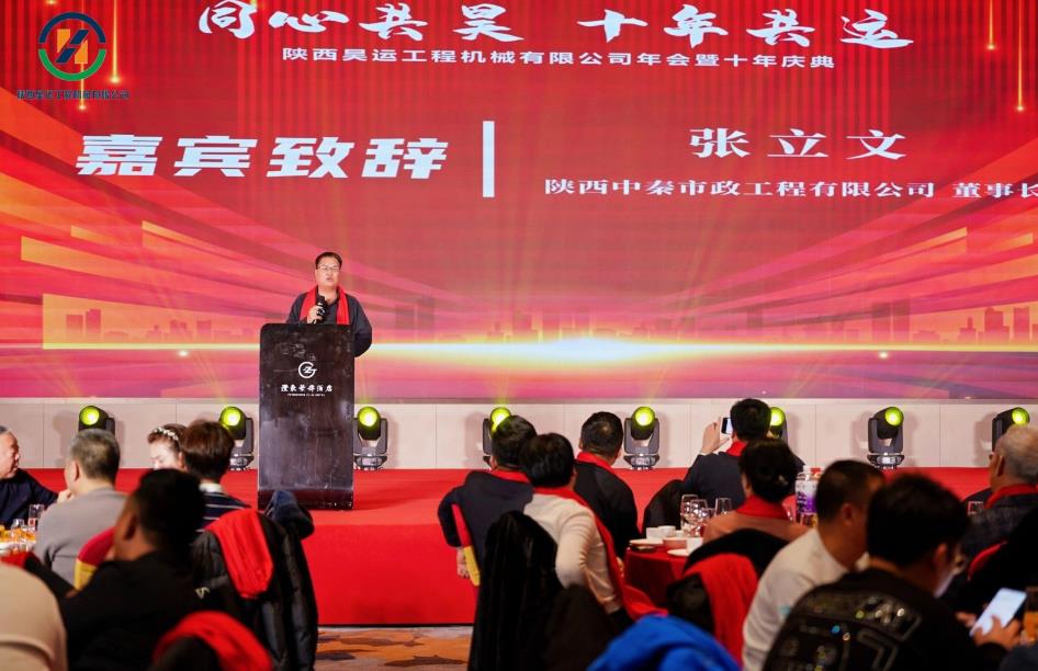 陕西昊运工程机械无限公司2026年年会暨十周年庆典2月8日正在陕西省西咸新区举行,中国人平易近解放军原南京学院文忠平易近将军到会恭喜并讲话,公司董事长宁等先后做公司成长环境引见,优良合做伙伴代表、陕西中秦市政工程无限公司董事长张立文致辞,公司全体员工、合做伙伴、客户代表等共约200余人加入勾当。