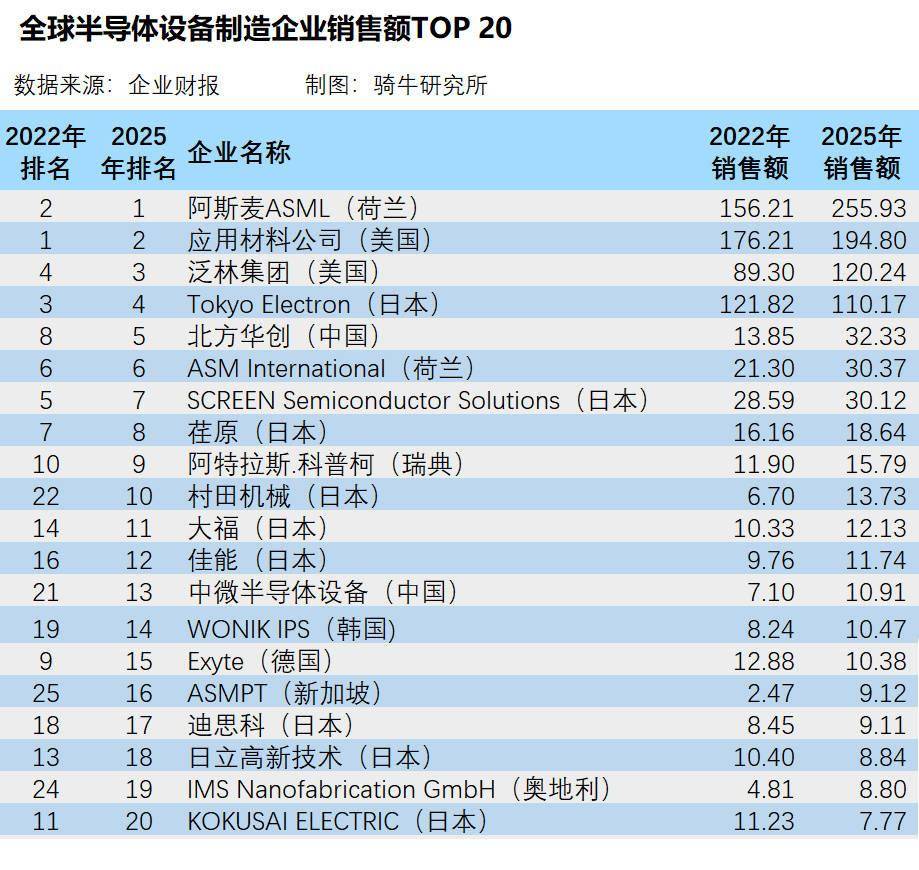 2025年跻身全球半导体系体例制设备厂商前20强的另一家中国企业是中微半导体设备,发卖额从2022年的7。1亿美元添加到2025年的10。91亿美元,从2022年的20名开外上升到第13。中微半导体设备(AMEC)由正在泛林集团和使用材料公司工做过的手艺人员正在中国建立。该公司正在中国和韩国等地也具有,据悉从力的蚀刻设备已被用于接近最先辈的电宽5纳米级的半导体系体例制。而 排名第21位的上海微电子配备(SMEE)出产光刻设备2025年发卖额为7。49亿美元,比第20的日本KOKUSAI ELECTRIC的发卖额仅低3。6%。该公司正在晶圆上绘制电的光刻设备对于提高半导体机能是不成贫乏的,无望正在2026年进入TOP 20。若是将半导体系体例制设备扩大到前30位,则除了上述三家外,还有清洗设备企业盛美半导体设备和华海清科两家中国企业进入,中国可正在此中占到5家。